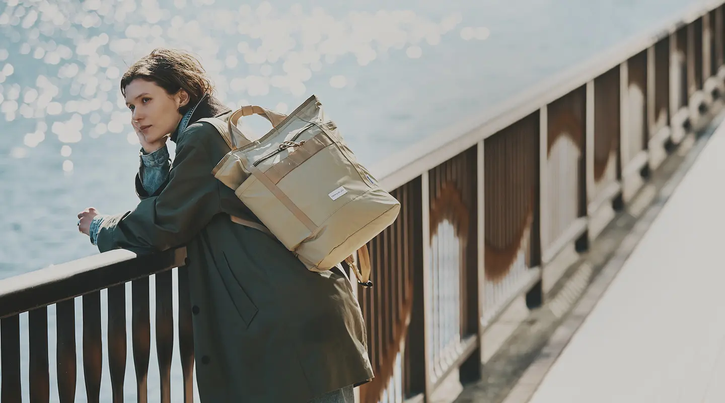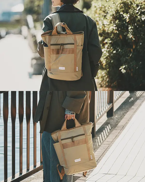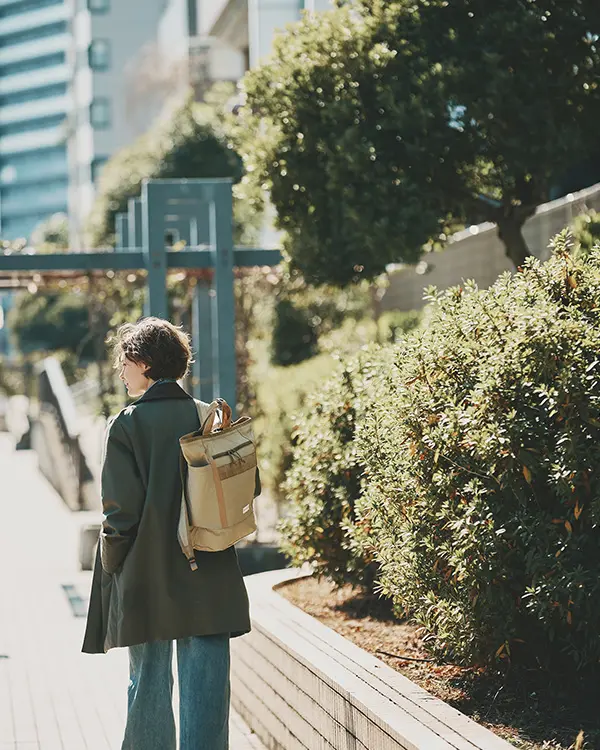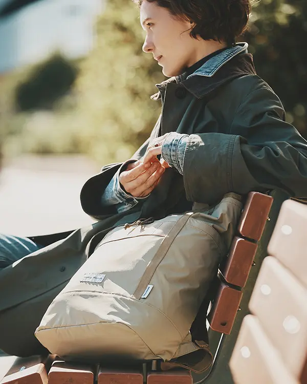 今回のバッグは日常使いはもちろん、旅行や、買い物など、いろんな場面で自然と使えるところが魅力だと思う。コンパクトに折り畳めるのもすごく便利です。あと、両肩で背負っていても、子どもっぽくならないところもいい。それにすごく快適です。素材も軽くて丈夫だし、素敵な要素をたくさん感じます。