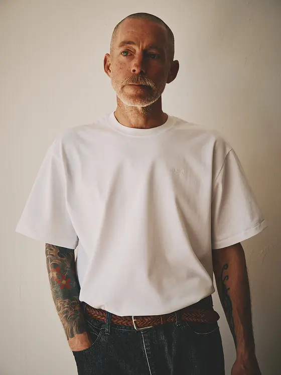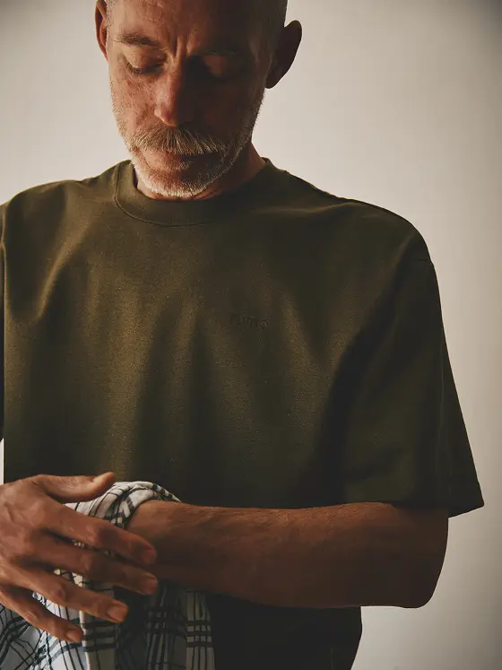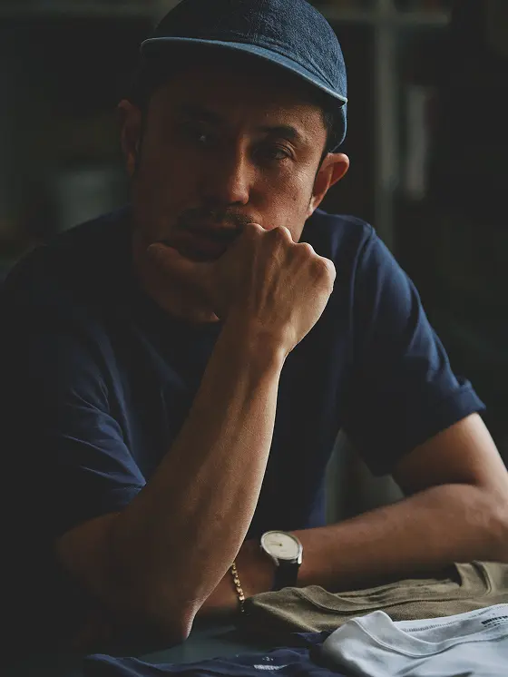 シルエットはやや細身で、着丈がちょっと長めになっています。インナーとして着ることも想定しているのと、ぼく自身、いまはこれくらいのフィットがちょうどいいんです。生地は古着のボディを参考にしました。打ち合わせでも「長く使えるものがいい」というお互いの共通点もあって、キックバックが強くて、型崩れしにくいものを選んでいますね。ガシガシ洗ってもらってもいい丈夫なものになってます。