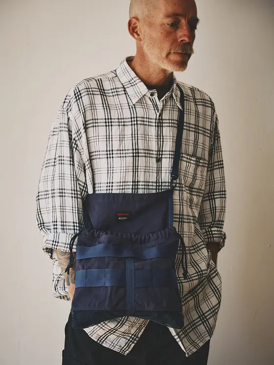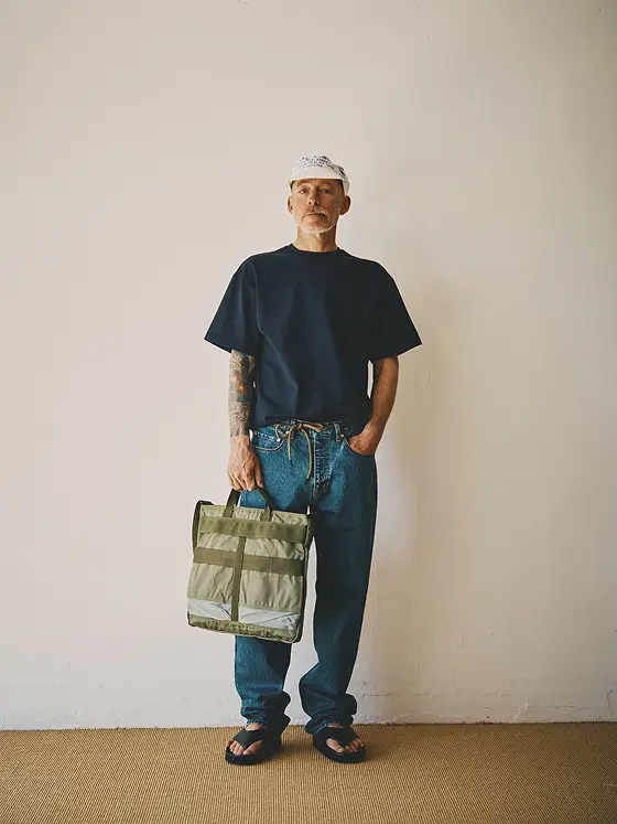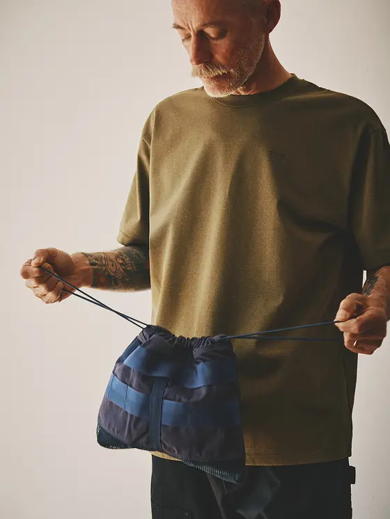 「上質なデイリーギア」をテーマに、エプロンバッグ、ヘルメットバッグ、そしてTシャツとポーチのセットを展開するが、