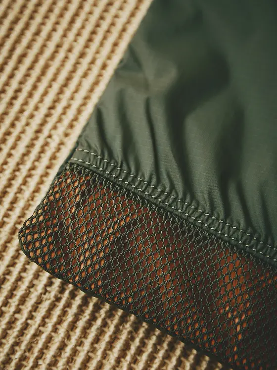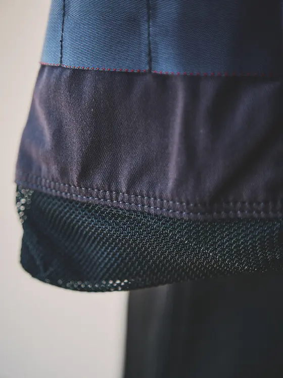 FUJITOは経年変化を楽しめる生地、あるいは、はじめからそれが感じられるものを選ぶのが得意なブランドなんです。今回の場合は後者をセレクトして、そうした天然素材と、メッシュなどの化学繊維が組み合わさることで、おもしろいものづくりをしていますね。