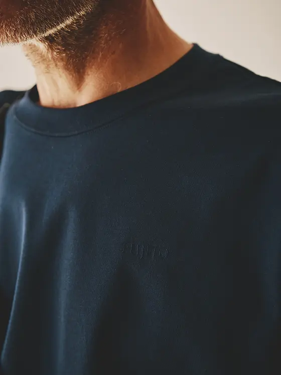 お互いの共通点はミリタリーだと思うんです。それが今回のTシャツにつながっています。古着のミリタリーTの生地や縫製などを参考にしながらデザインしました。発売の時期も暖かな季節だし、ちょうどいいですよね。白はやっぱり外せないのと、ぼくが持っていた古着のTシャツを参考にオリーブグリーン、あとはぼくのいち押しカラーであるネイビーの色展開にしました。こだわりとしてはFUJITOのロゴが前にあるところ。これは普段あまりやらないのですが、思い切ってチャレンジしてみました。ボディと同色で、ちょっと光沢のある刺繍で表現しているので、大人でも着やすい落ち着いたアイテムに仕上がっていると思います。