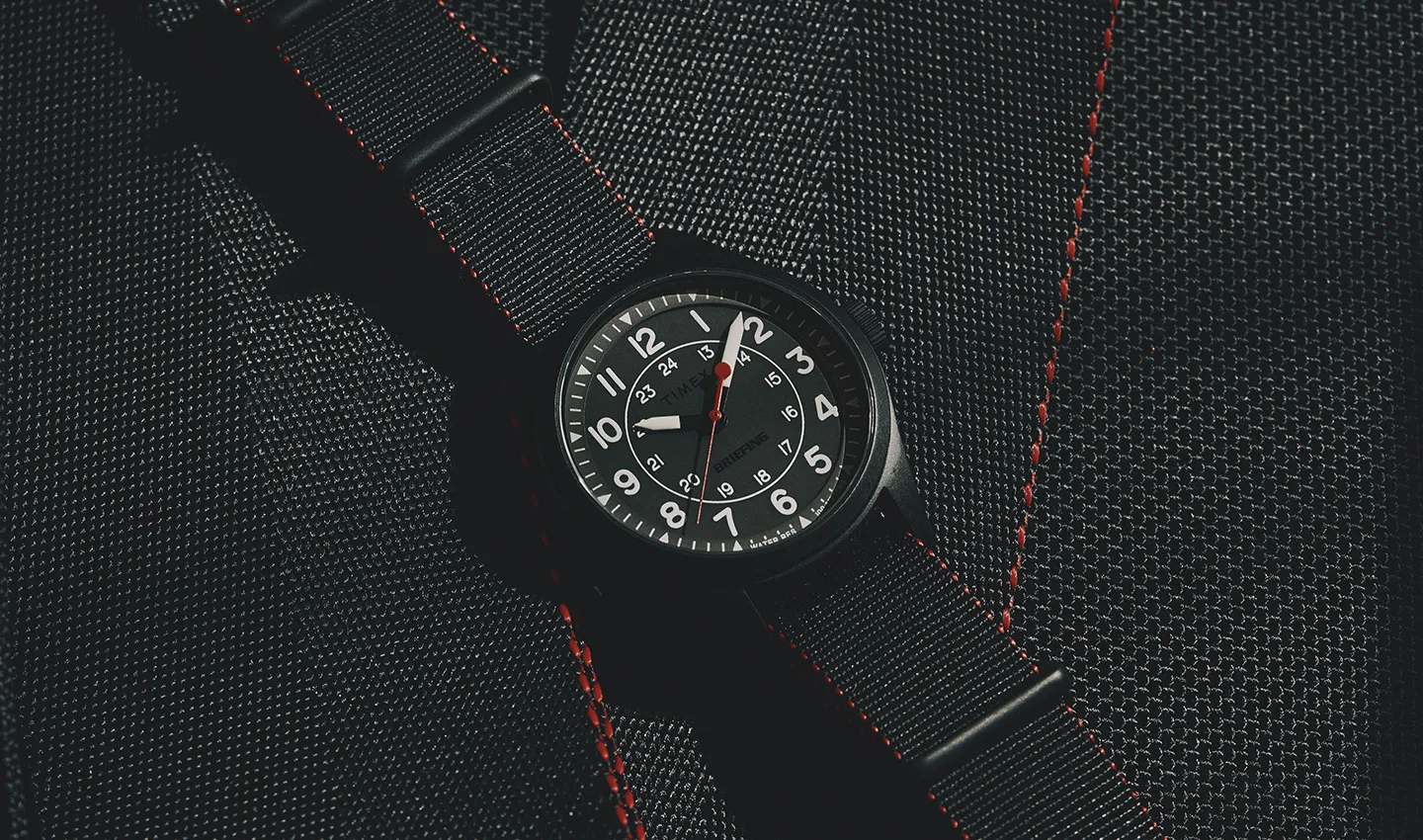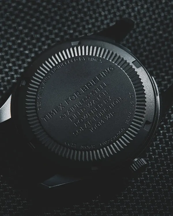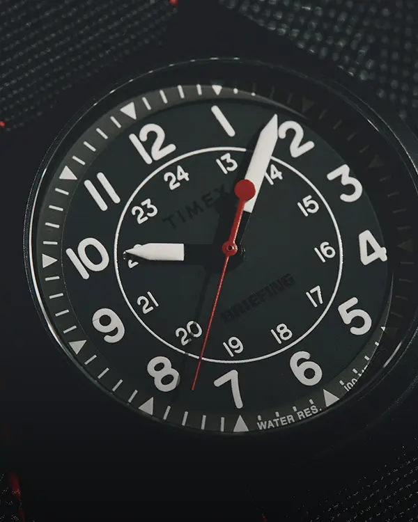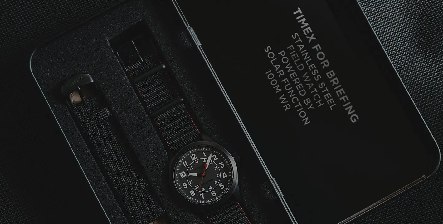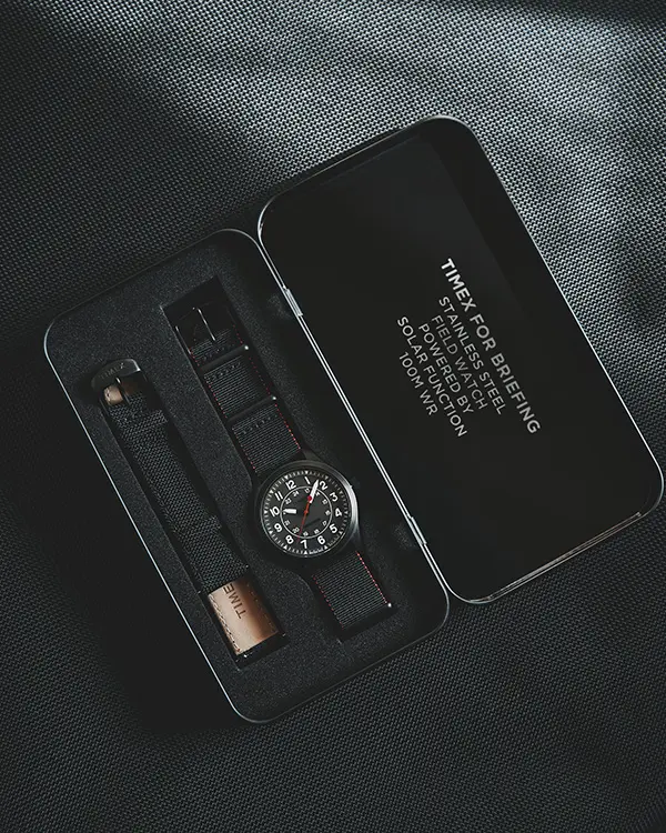 アウトドアや軍用由来の実用性をベースに、日常でも使えるミニマルな外観にまとめています。ビードブラスト製法で光沢を抑えた時計本体の質感に合わせ、文字盤面に配したTIMEXとBRIEFINGのロゴも半マットにすることで控えめに表現。さらに、付け替えられる2種類のストラップがアクセントを添え、今回のコラボレーションのために特別制作をした両ブランドのロゴが入ったティン缶に収めてお届けします。